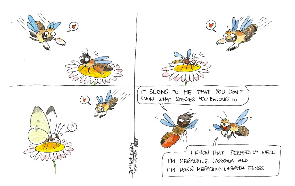 I was asked to draw a cartoon about a male Megachile lagopoda. Stephanie Rübenach, a wild bee photographer, told me that she likes these bees because of their habit of rushing at everybody sitting on a flower – be it another bee, or a fly, or even a butterfly… Yes, male bees can be little bullies. Some of them aggressively defend their little territories (have I ever told you about Anthidium manicatum?) but often it is rather curiosity and eagerness to mate than aggression. They just have to make sure this butterfly over there is not a female of their own species.