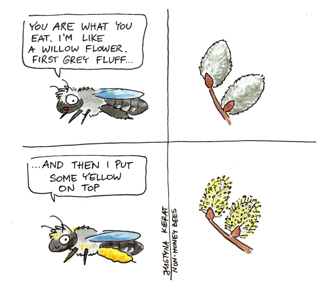 The Grey-backed Mining Bee (Andrena vaga) is one of signs of spring in Europe. It is a pollen specialist (oligolectic) species, and the females collect pollen only from willows (Salix). I didn’t notice that before but the fluffy fur on their thorax is strikingly similar in colour and texture to the hairy willow catkins before they become covered in yellow stamens.