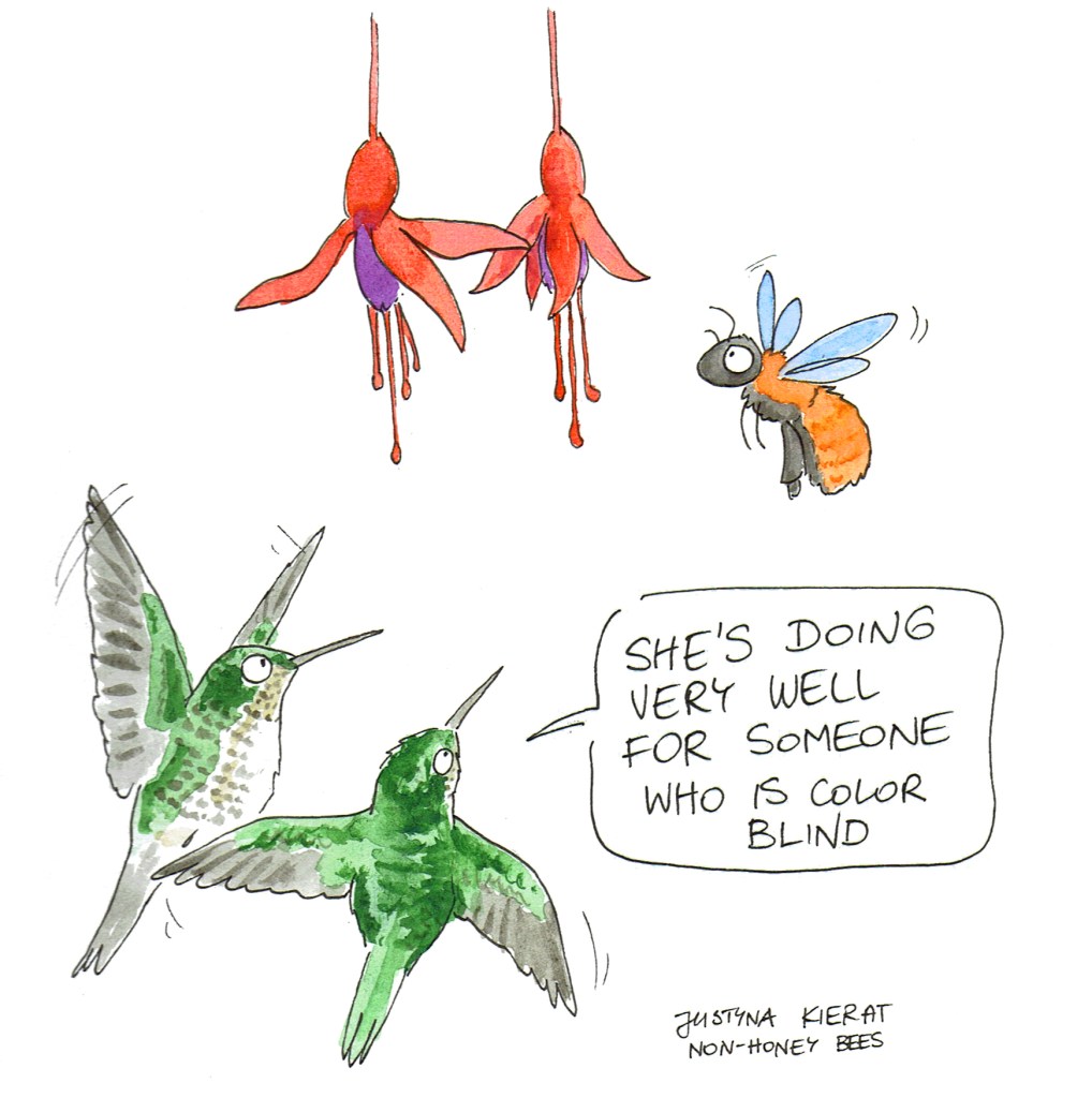 And regarding the cartoon, the hummingbirds are quite justified in speaking about color-blindness of the bumblebee, as their color vision is amazing, better than bees’ and ours. The bumblebee in the cartoon is Bombus dahlbomii, the rare South American species which is known for its love of red flowers.