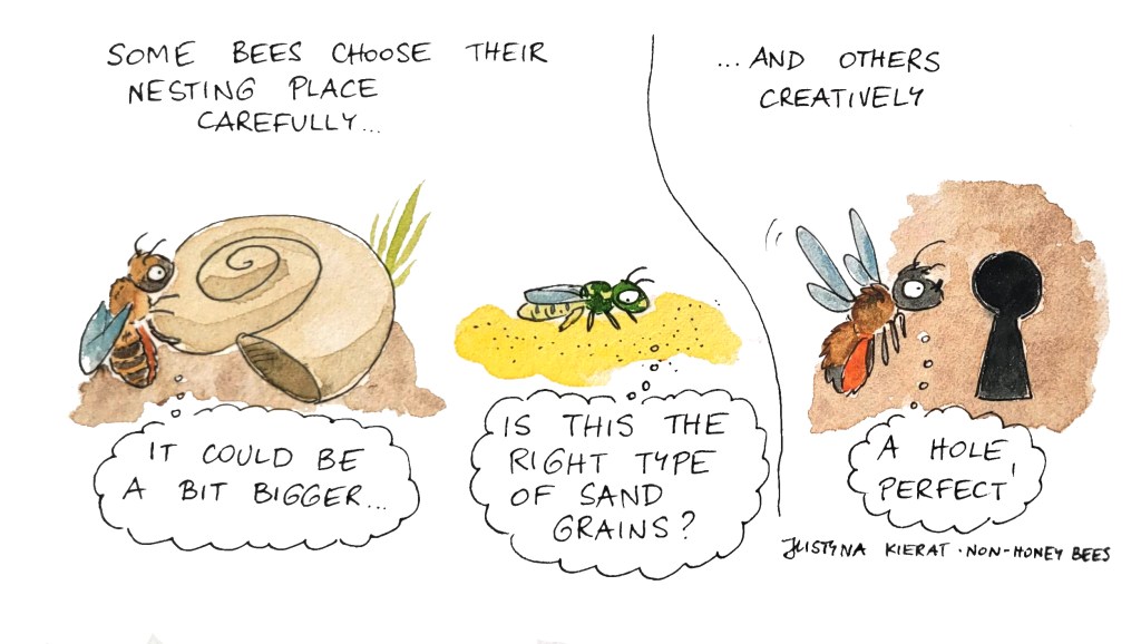 As you surely remember, there are over 20 000 bee species described by scientists so far. No wonder that among so many species, there is also a substantial diversity of nesting strategies. Most species nest in the soil, a smaller proportion chooses various cavities above ground, some make constructions from mud or resin. You can find a bee nest in a snail shell, plant gall or a termite mound.