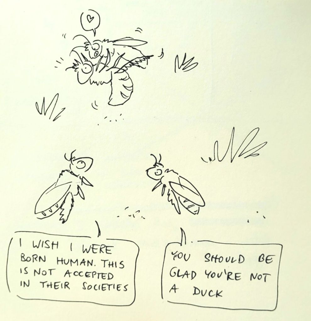The field season doesn’t leave me much time to draw but I didn’t want to skip a Monday cartoon, so a quick drawing about bees’ violent mating practices. When you look at males trying to mate with a female, you can often see she is not happy and trying to throw him off her back. In human standards it looks like absolutely unacceptable behaviour… but think about ducks where males are even more aggressive in forcing copulation. A female can be injured or drowned in the process!