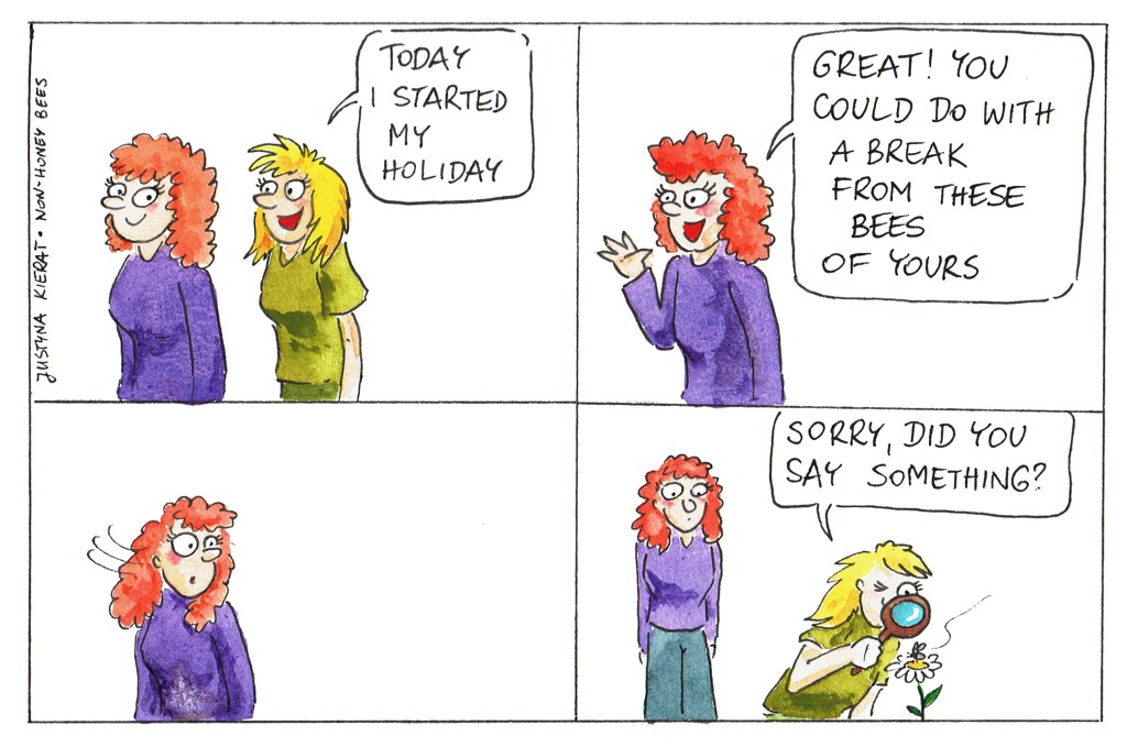 I first posted this cartoon on my social media. I wasn’t sure if you would find it funny, but after receiving positive feedback, I decided to share it here as well. I drew this cartoon during a bee identification course. It was excellent… and intensive! We worked so much on identification keys that they became my first association with the word ‘key’ ๐