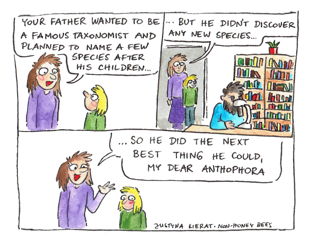 Taxonomists are scientists who study species. They seek to answer questions such as which traits distinguish one species from another, and how species evolve. When a taxonomist discovers a species that is new to science, they have the right to name it. Each scientific name has two parts: the first part is usually fixed, as it refers to the genus to which the species belongs. The discoverer is free to choose the second part. Provided they comply with the rules set out in the International Code of Zoological Nomenclature, they can choose anything. Some taxonomists name species based on their characteristic traits โ for instance, ‘bicornis’ means ‘two-horned’ and refers to the small horns on the face of the female red mason bee (Osmia bicornis). Others honour important figures in science or people who are important to them. You can also find names that refer to popular culture or are humorous.