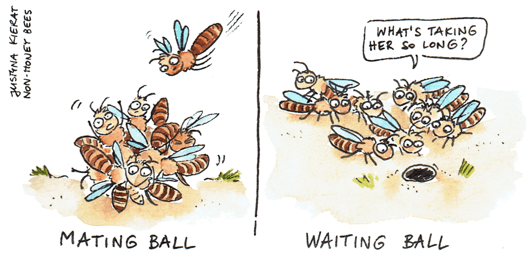 Recently, I had the pleasure of admiring a nesting aggregation of my beloved ivy bees in the company of other melittologists. At one point, I heard someone say, ‘Here’s the waiting ball.’ As you might have guessed, I misheard โ it was actually the mating ball. But my imagination began to run: what should a waiting ball of bees look like? You can see my idea here.