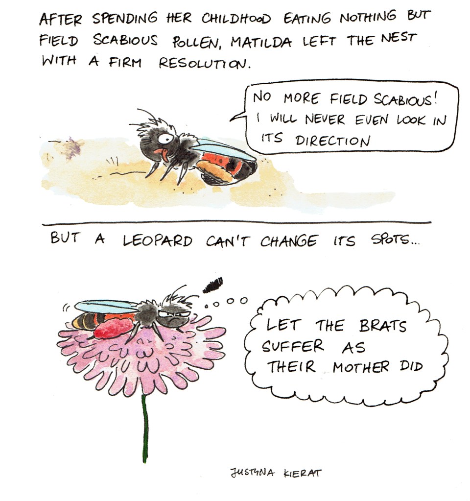 Some bees can forage on a wide taxonomic variety of flowering plants. Others need a more restricted set of species, sometimes a very narrow one. Bee species that rely on flowers from one plant family, or a subset of it, are called oligolectic. Those that choose only one plant species (or, according to some authors, one plant genus) are called monolectic. On the cartoon you can see a female silvery pantaloon bee Dasypoda argentata, a narrow specialist on cream scabious Scabiosa ochroleuca.