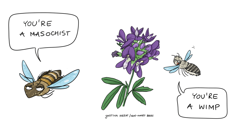 Honeybee can visit many plant species all over the world – but it doesn’t make it the best pollinator for them all. For example, it doesn’t like visiting alfalfa (Medicago sativa). In order to be pollinated, alfalfa flower has to be tripped by a bee, and it hits it in the head with its stamens in the process. The honeybee doesn’t like such a mistreating but there are other species, like the alfalfa leafcutter bee (Megachile rotundata) or the alkali bee (Nomia melanderi) who don’t care. Both of them are bred as pollinators of alfalfa.