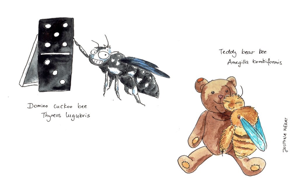 The bee celebrating on my cartoon is Megalopta genalis – one of few bees well equipped to go to the New Year’s Eve party – it is active year-round (so, 31st December, too) and stays up late.