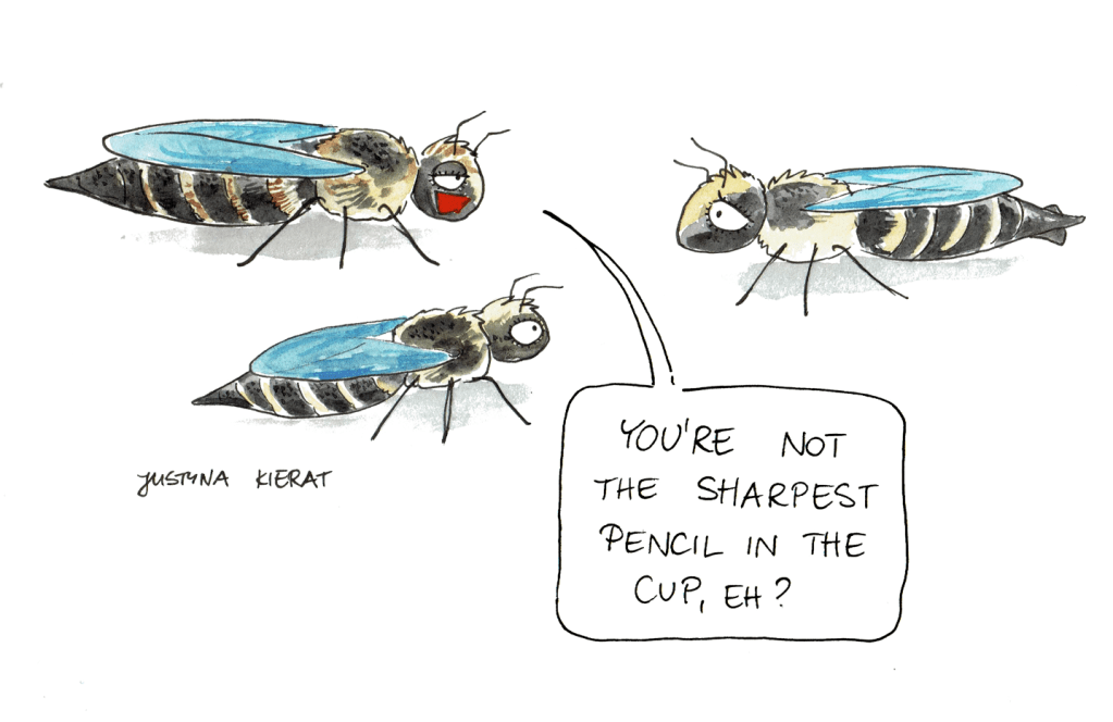 Sharp-tailed bees (genus Coelioxys) owe their common name to the shape of the ending of the abdomen. In females, the abdomen usually ends in narrow, sharp spine. But it’s not always the case. For my cartoon I chose Coelioxys alatus but the other candidate I was considering was Coelioxys obtusiventris