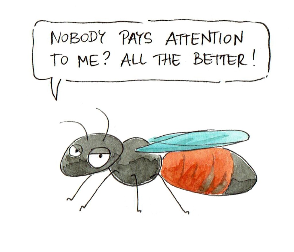 I’m very fond of cuckoo bees. They don’t build their nests and have amazing adaptations to make other bee species raise their children. Many of them, “true” cuckoos, just lay their eggs in the nests of solitary bees, and their success depends on making it so that the nest owner doesn’t know of the parasite’s egg in her nest. Others, like the cuckoo bumblebee pictured on the cartoon you see, invade nests of social species and usurp the title of the queen. After succesfully establishing its position in the nest, the cuckoo bumblebee female begins laying her eggs and host workers care for them like for their own sisters. The cuckoo keeps discipline by biting and dominating the workers (and the old queen, if she survived) but usually doesn’t kill the workers, as they are precious workforce for her young.